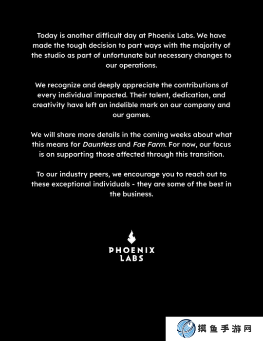 合作狩猎游戏《无畏》以及经营类游戏《妖精农场》开发商 Phoenix Labs 日前在领英上发布公告称,作为工作室“不幸但必要的改变”的一部分,它已裁员了“工作室大部分”员工。