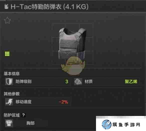 - H-Tac特勤防弹衣: 35耐久,仅防护胸部。材料一般,勉强能抵挡部分三级穿透弹。