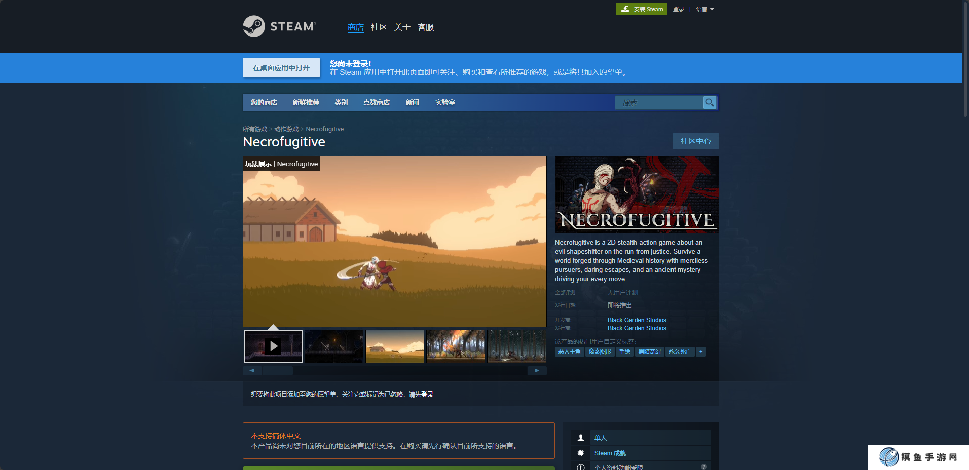 《Necrofugitive》是一款2D隐形动作游戏,而这款游戏的下载网址就是购买平台的购买页面,比如Steam版就是在购买页面购买之后,点击页面中的马上开玩就可以开始下载了。