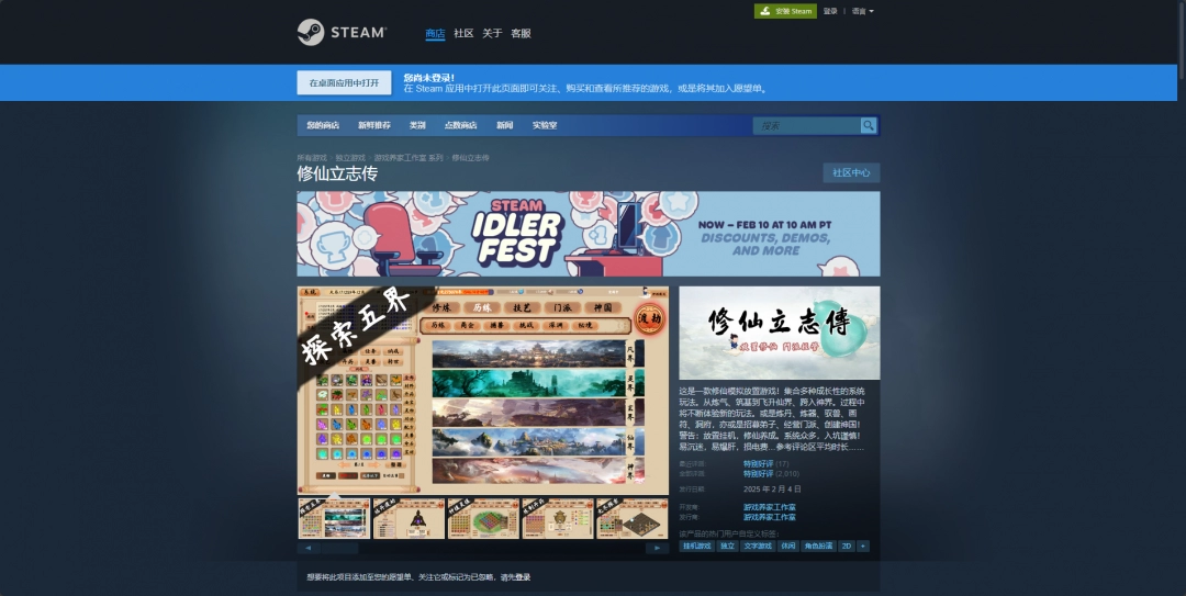 Steam平台需要先安装Steam平台,之后注册一个账号登录,然后搜索“修仙立志传”进入商店购买页面。