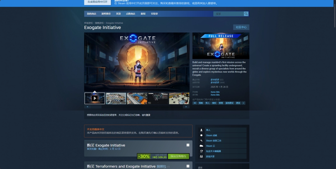 《Exogate Initiative》在Steam平台有标准版,售卖价格是港币156元。