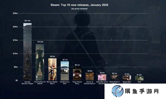 Game Discover Co发布了2025年1月Steam十大最赚钱的新发售游戏,1月17日发售的《真三国无双:起源》凭借2140万美元收入霸气登顶相当于1.55亿元,《最终幻想7:重生》和《漫威蜘蛛侠2》位列二三名,收入为1350万美元和820万美元(5946万元)。