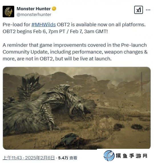 《怪物猎人:荒野》第二次公开测试预加载现已在全平台开启,如果玩家已经下载过第一次公开测试的程序,那么只需要更新即可。《怪物猎人:荒野》第二次公测将在2月7日11:00至2月10日10:59,以及2月14日11:00至2月17日10:59之间开启,新增了主题怪物“锁刃龙”和回归怪物“毒怪鸟”,玩家在公开测试中创建的角色和艾露猫可继承至正式版。
