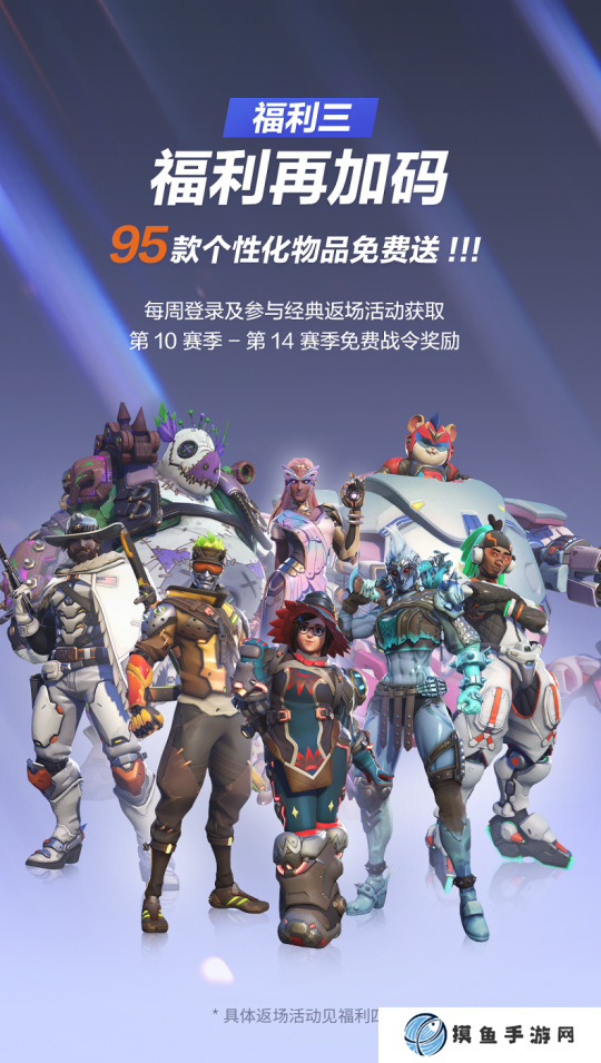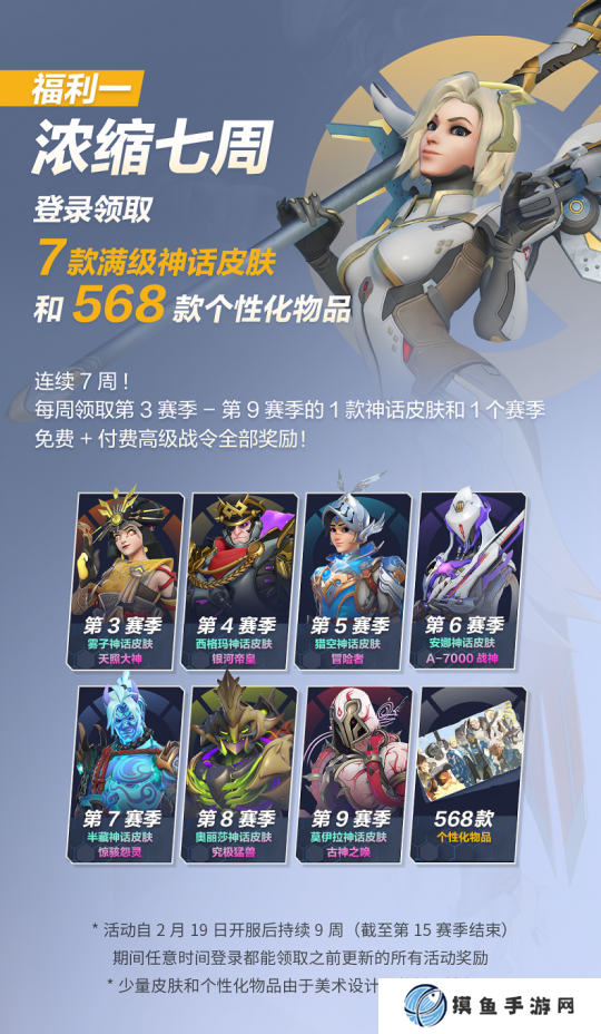 2月19日《守望先锋》国服开服后,每周登录游戏均可领取第3赛季-第9赛季中的一个对应赛季神话皮肤和一个赛季的免费+付费高级战令全部奖励。奖励可连续领取7周,共计7款满级神话皮肤和568款个性化物品。活动持续9周,截至第15赛季结束,在前7周就会将奖励更新完毕。并且,玩家在活动期间的任意时间登录游戏都能领取之前更新的所有登录奖励,不用担心错过!