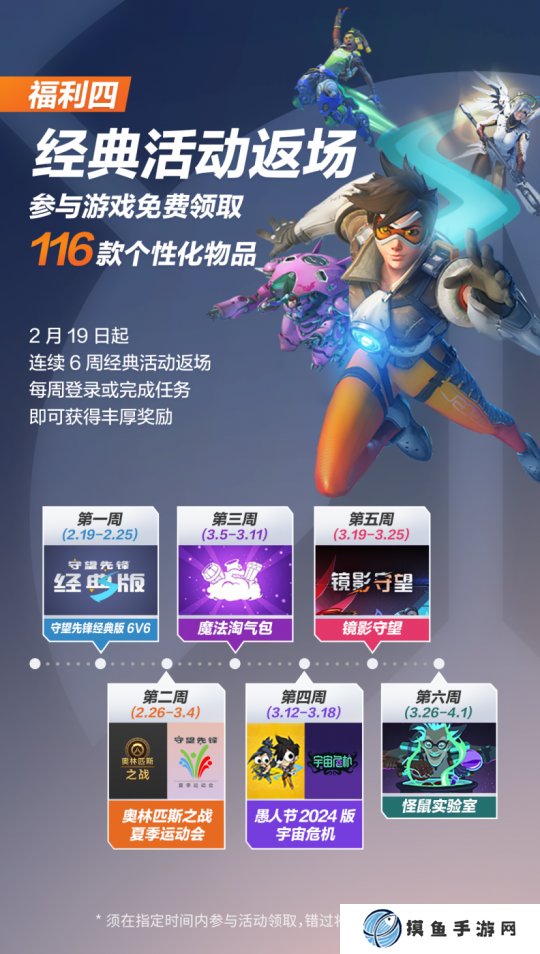 开服盛典,自然不能少了经典活动相伴。2月19日开服后,每周都有不同的经典活动开放。参与陆续开放的守望先锋经典版6V6、魔法淘气包、镜影守望等活动,共计可获得116款个性化物品。需要注意的是,经典活动在指定时间内开放,错过活动将无法获取奖励。