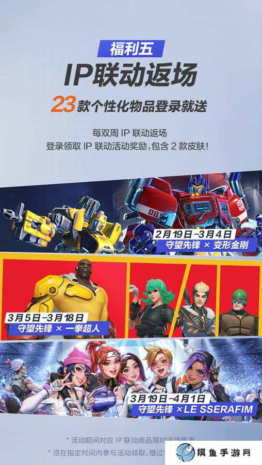 同时,多项IP联动也将返场,23款个性化物品登录就送。2月19日-3月4日(第1、2周),《变形金刚》联动中的6款个性化物品将返场;3月5日-3月18日(第3、4周),《一拳超人》联动中包含士兵:76皮肤“无证骑士”在内的6款个性化物品将返场;3月19日-4月1日(第5、6周),“LE SSERAFIM”联动中包含狂鼠皮肤“法尔克西·詹姆斯”在内的11款个性化物品将返场。IP联动返场活动同样在指定时间内开放,错过活动将无法获取奖励。