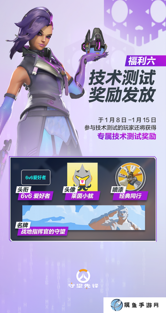 2月19日开服后,参与了不限号技术测试的玩家还将获得专属技术测试奖励——【头衔】6v6爱好者、【名牌】战地指挥官的守望、【头像】莱茵小鱿、【喷漆】经典同心。