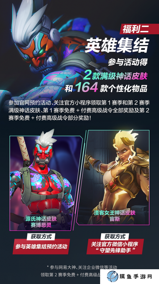 现在参与官网回归预约活动、关注官方微信小程序活动,以及网易大神、企业微信等相关活动,还可免费再得第1赛季、第2赛季的对应赛季神话皮肤和免费+付费高级战令全部奖励。2款满级神话皮肤——源氏神话皮肤“赛博恶灵”(4级)和渣客女王神话皮肤“宙斯”(4级)及共计164款个性化物品都可在2月19日游戏开服后登录领取,千万不要错过!