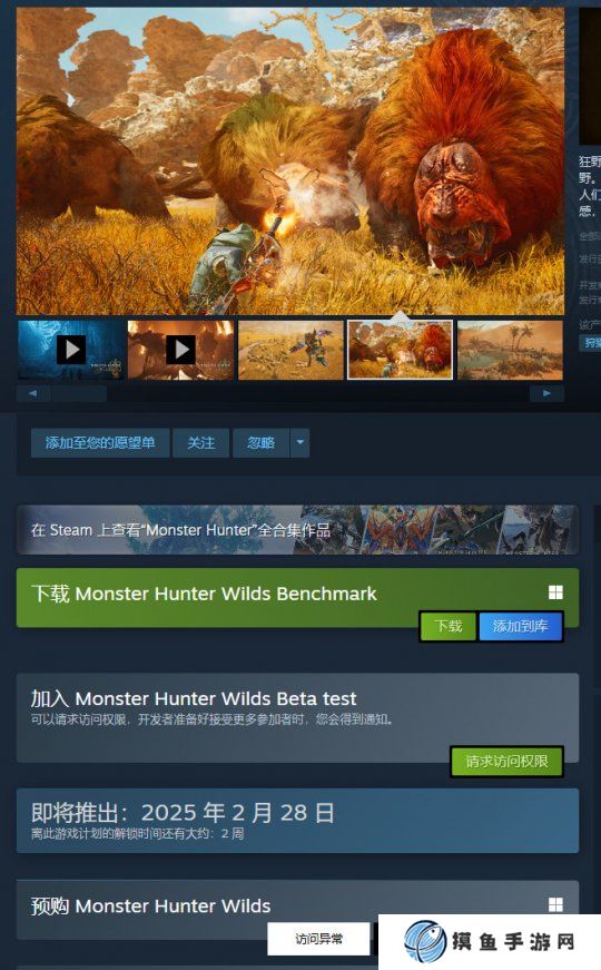 如果你想在Steam参加BETA公测,只需要在《怪物猎人:荒野》Steam商店页点击“请求访问权限”,便可进入,确保你的PC有24GB的硬盘空间。