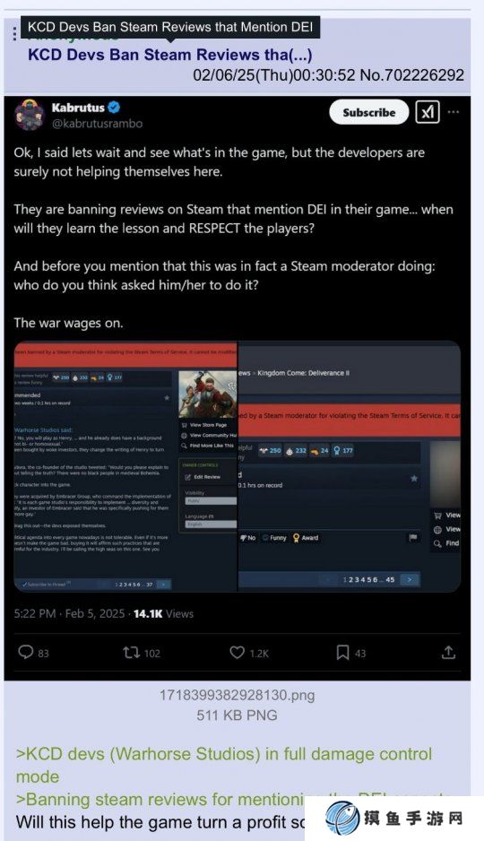 现在《天国:拯救2》禁止大家在Steam上讨论DEI。游戏博主Pirat_Nation发推文称,一些玩家发布的DEI评论会被立即删除,虽然那些评论看起来没有违反任何规则。