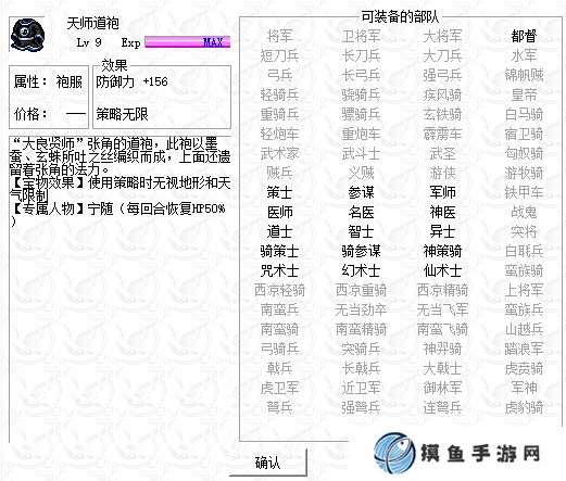 《姜维传》中的强大宝物装备是非常多的,而且这类宝物装备都可以给部队装备,天师道袍就是其中一种,获得方法是宁随入队即可获得,宝物效果是降低敌方对自己物理攻击的命中率30%,防御力保持上升状态(怀旧模式下无增加防御力效果)。