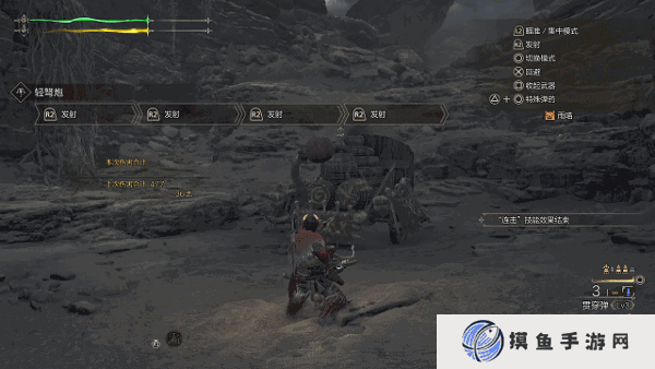 按下右攻击键,将进入速射模式,也可以翻滚回避时发动。